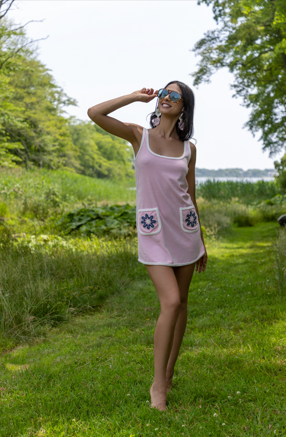 A playful retro-inspired terry velvet mini dress designed in a relaxed shift silhouette. It is detailed with contrasting trims along the neckline, armholes, hem, and pocket edges. Two front pockets are adorned with hand-knitted colorful floral patch motifs, adding a charming artisanal touch. Perfect for both beachwear and everyday styling.