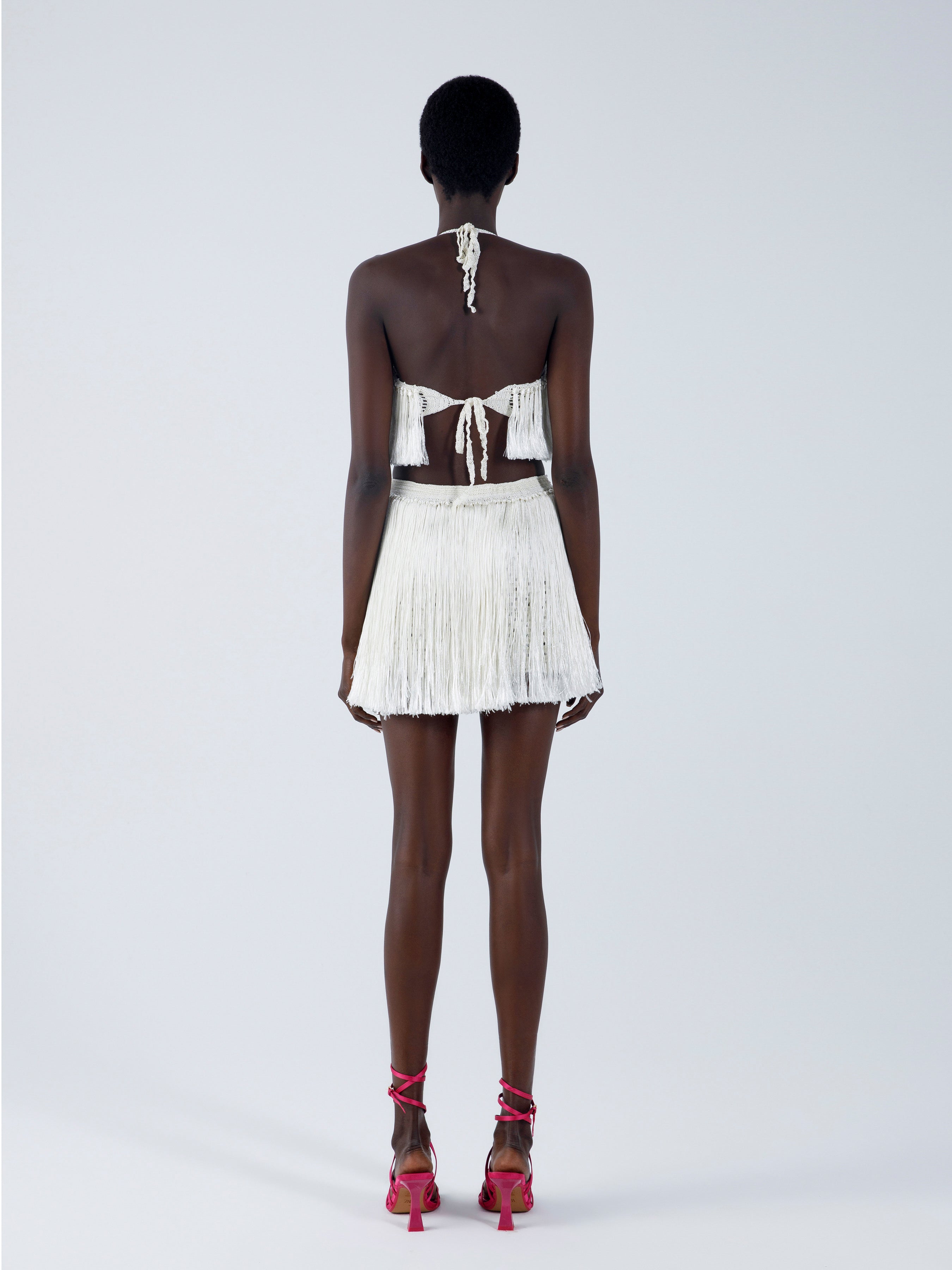 Be ready to celebrate a big occasion or just a beautiful evening with our party-ready Angelica fringe halter top. With slinky luxe fringe and a daring open back, this top was meant to move with you as you hit the chicest soirees of the season. Pair with the matching Angelica mini skirt and some neutral heels for a party-ready look.